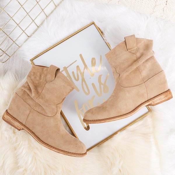 - Ботуши a'la Каубойски ботуши на ниски токчета от естествена кожа в бежово. Моделът има затопляне отвътре под формата на мека кожа. Ботушите се закопчават с цип. Идеални за по-студените дни.