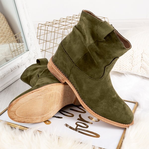 - Zielone botki a'la kowbojki wykonane ze skóry ekologicznej zamszowej. Model posiada ocieplenie w środku w formie miękkiego futerka. Obuwie na niskim krytym koturnie. Buty zapinane suwakiem. Idealne na chłodniejsze dni.