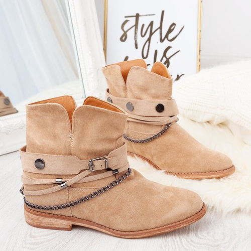 - Botki w stylu kowbojek na krytym koturnie. Materiał wykonania to eko-zamsz w beżowym kolorze. Środek buta jest ocieplony futerkiem. Obuwie posiada ozdoby, które można ściągnąć. Doskonałe do codziennej garderoby!