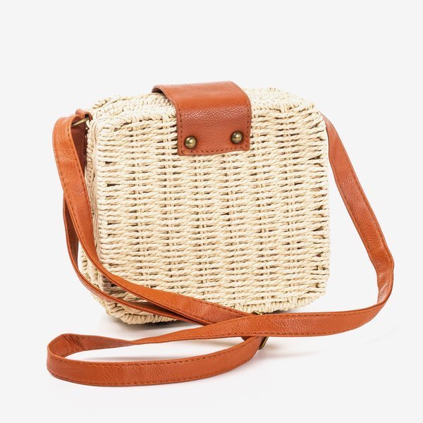 - Kwadratowa damska torebka typu kuferek wykonana z plecionej papierowej słomki w kolorze beżowym. Posiadają zamknięcie na klamrę. Podszewka tkaninowa.