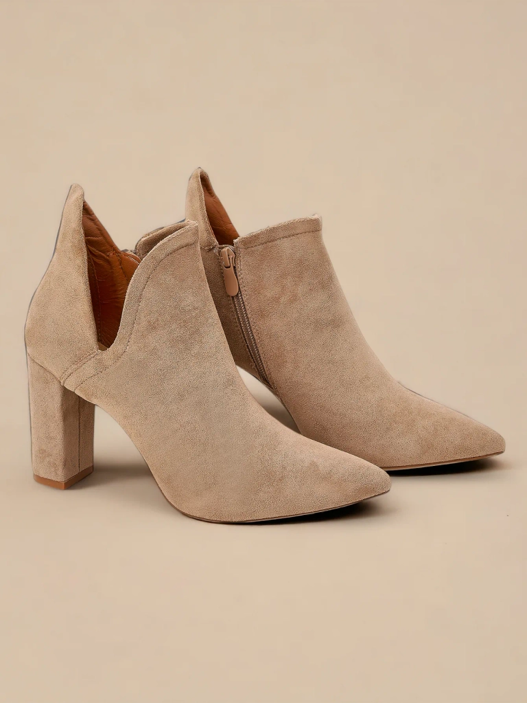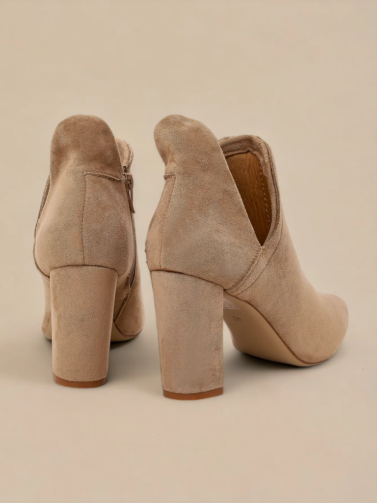 - Rewelacyjne botki na wysokim obcasie w kolorze jasnobrązowym. Cholewka wykonana z miękkiego eko-zamszu, zaś wkładka pokryta tkaniną. Nosek zakończony w szpic, który optycznie wyszczupla nogi. Model zapinany na suwak po wewnętrznej stronie.