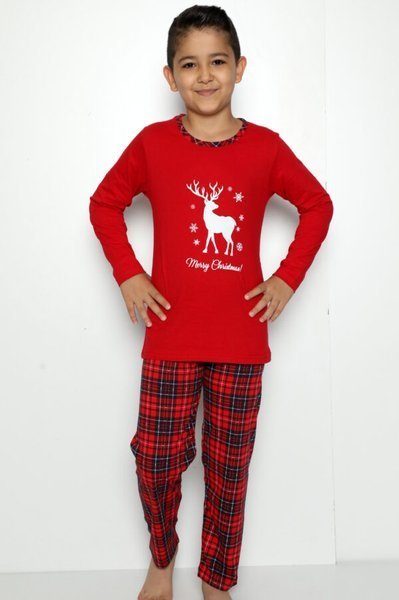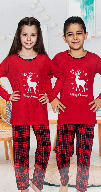 - Dwuczęściowa dziecięca piżama w kolorze czerwonym, wykonana ze 100% miękkiej bawełny. Model zdobiony świątecznym printem, spodnie w kratkę, bluzka z reniferem. Ten model to idealny prezent na święta! UWAGA: Dokładność pomiaru (+/-) 1 cm.