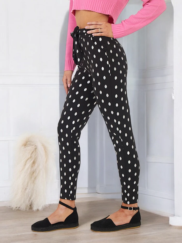 - Stylowe damskie spodnie typu tregginsy, wykonany z rozciągliwej tkaniny w srebrne kropeczki. Model posiada gumkę w pasie oraz wiązany pasek, z przodu dwie wsuwane kieszenie. UWAGA: Dokładność pomiaru (+/-) 1 cm.