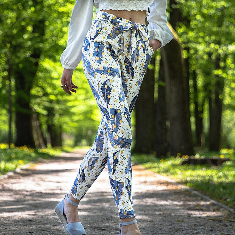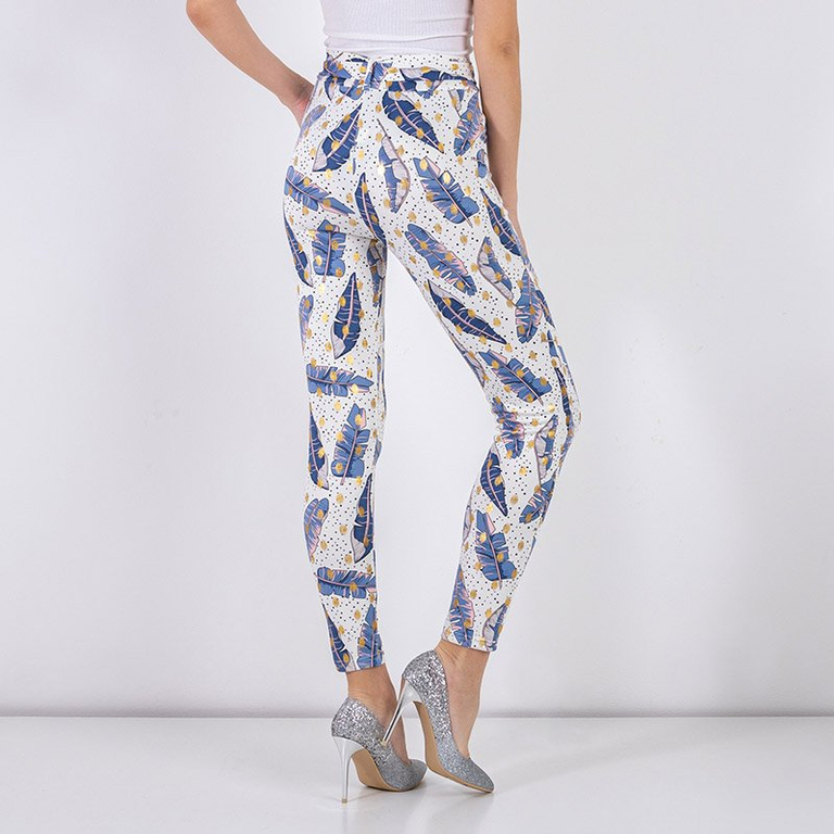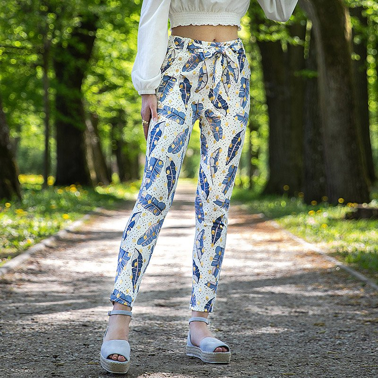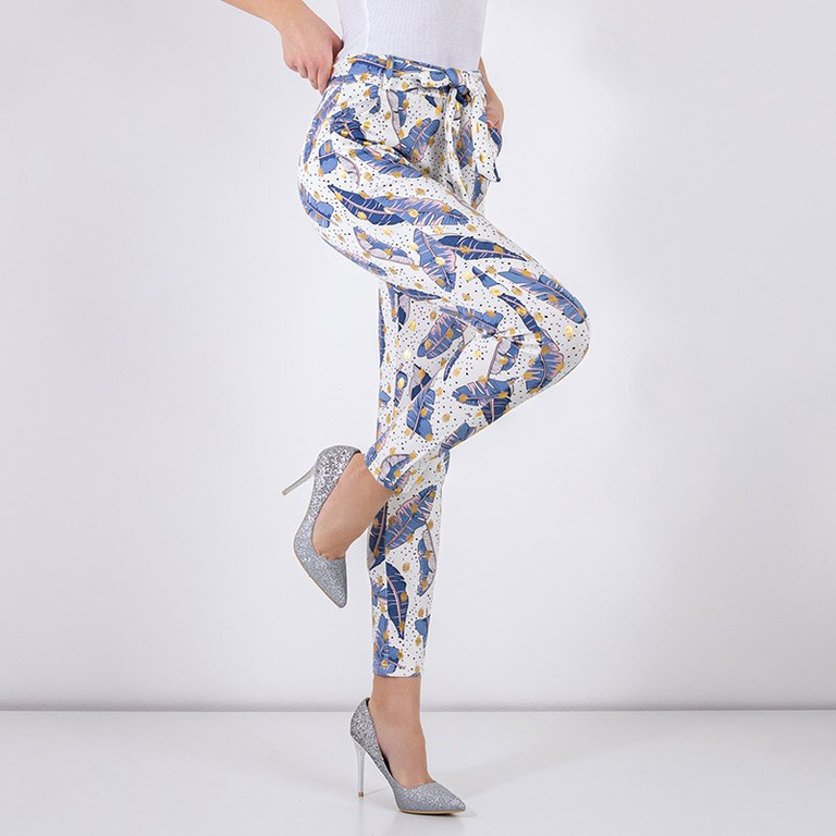• Eleganckie damskie spodnie typu tregginsy, wykonane z rozciągliwej tkaniny w piórka. Model posiada rozciągliwą gumę w pasie, dwie wsuwane kieszenie i pasek w dopasowanym kolorze. Idealny dodatek do koszuli! UWAGA: Dokładność pomiaru (+/-) 1 cm