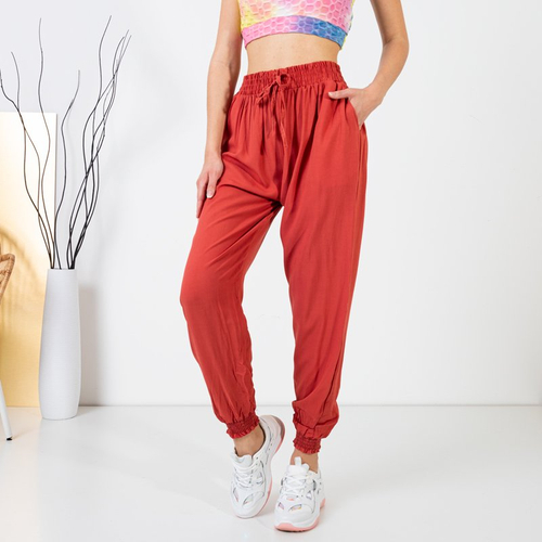 - Lekkie damskie materiałowe spodnie typu haremki, wykonane z tkaniny bawełnianej. Model posiada gumkę w pasie i nogawkach, z przodu - dwie wsuwane kieszenie. Zapewniają pełen komfort i swobodę ruchów. UWAGA: Dokładność pomiaru (+/-) 1 cm.