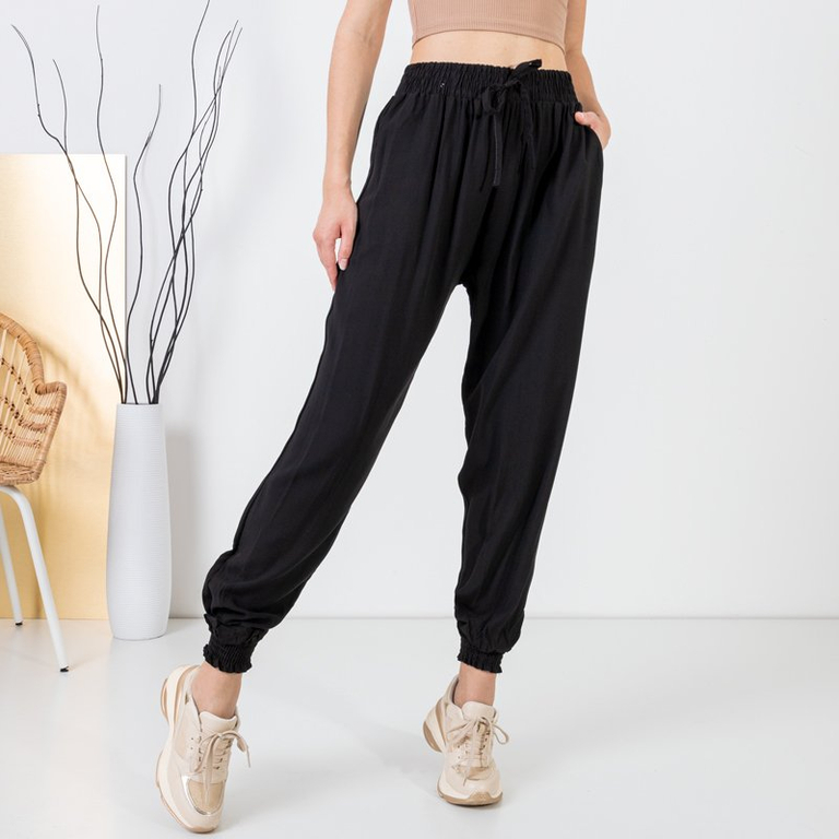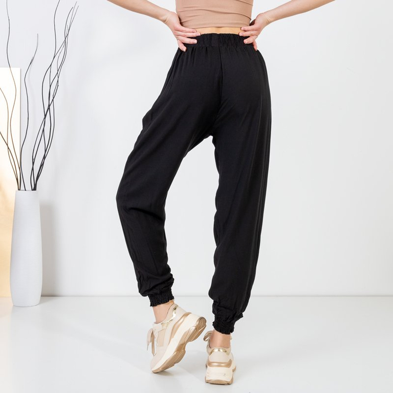- Lekkie damskie materiałowe spodnie typu haremki, wykonane z tkaniny bawełnianej. Model posiada gumkę w pasie i nogawkach, z przodu - dwie wsuwane kieszenie. Zapewniają pełen komfort i swobodę ruchów. UWAGA: Dokładność pomiaru (+/-) 1 cm.
