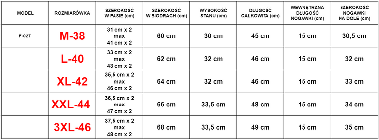 [A] Szerokość w pasie (cm) | [B] Szerokość w biodrach (cm) | [C] Wysokość stanu (cm) | [D] Długość całkowita (cm) | [E] Wewnętrzna długość nogawki (cm) | [F] Szerokość nogawki na dole (cm) | ||||||||||||||||||||||||