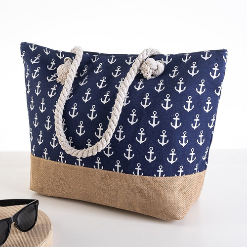 - Stylowa damska torebka plażowa, wykonana z materiału tekstylnego, który jest wykończony printem w kotwice. Model z dwoma grubymi uchwytami z mocnego sznura. W środku jedna komora bez dodatkowych kieszeni, zapinana na zamek błyskawiczny.