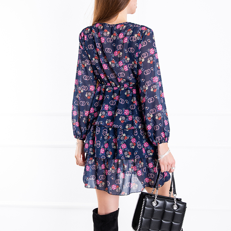 • Sukienka damska przed kolano, z długim rękawem oraz falbankami. Dekolt w serek oraz piękny i modny print w kwiaty. Super wybór na co dzień czy do pracy!