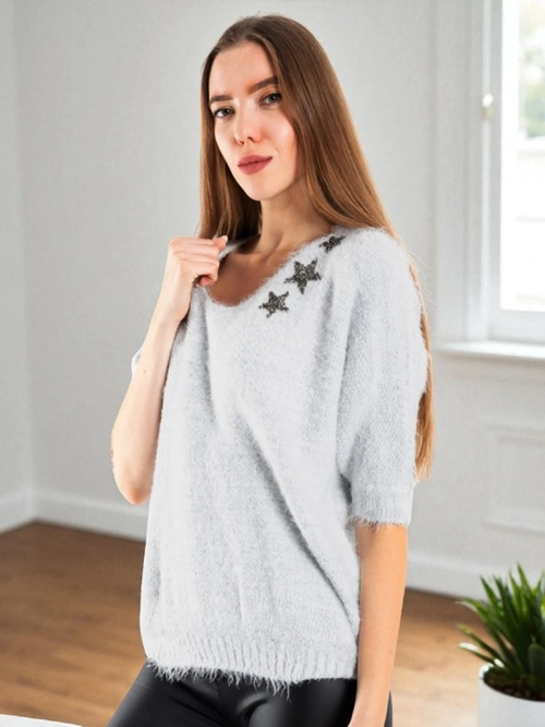 - Klasyczny damski sweter oversize z długimi rękawami. Dekolt w serek. Bardzo miękka tkanina akrylowa- przyjemna w dotyku. To niezbędny element garderoby.