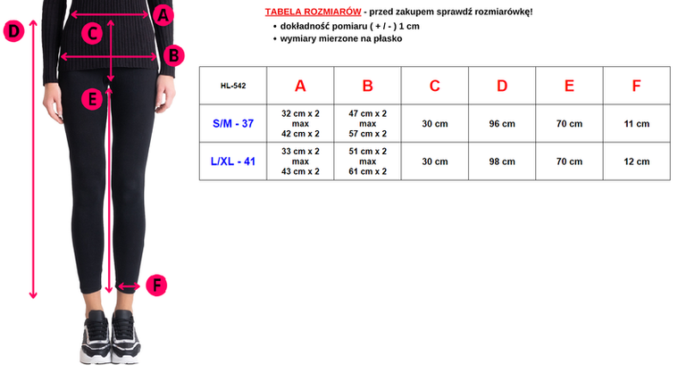 | [A] Szerokość w pasie (cm) | [B] Szerokość w biodrach (cm) | [C] Wysokość stanu (cm) | [D] Długość całkowita (cm) | [E] Wewnętrzna długość nogawki (cm) | [F] Szerokość nogawki na dole (cm) | ||||||