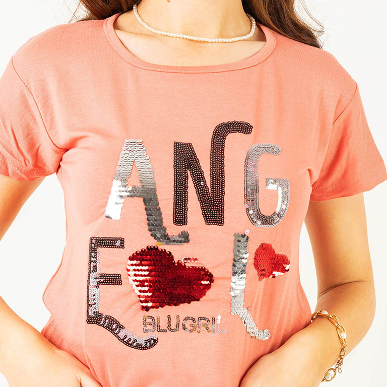 Koralowy damski t-shirt z napisem z cekinów - Odzież