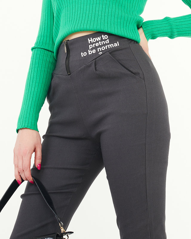 Ciemnoszare tregginsy damskie materiałowe z ozdobnymi napisami - Odzież