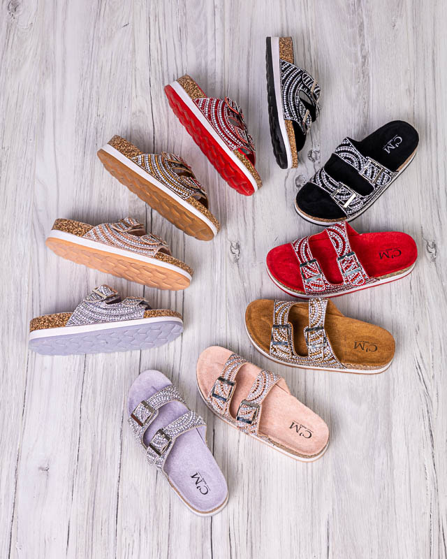 - Eleganckie klapki damskie ze skóry ekologicznej zamszowej, zdobione cyrkoniami. Podeszwa w połowie wykonana z tworzywa gumowego i również zdobiona cyrkoniami. Perfekcyjny dodatek do niemal każdej stylizacji!