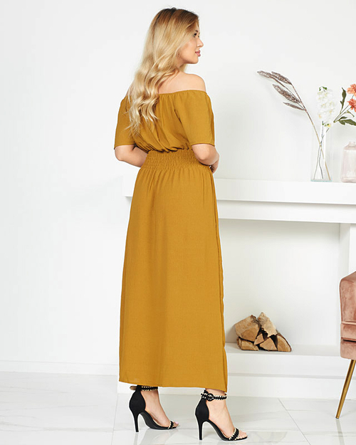 Musztardowa sukienka maxi z gumką w pasie- Odzież