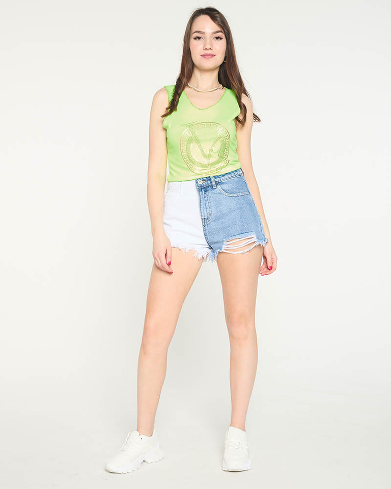 - Kobiecy top na ramiączkach wykonany z elastycznego materiału. Na przodzie złoty print. UWAGA: Dokładność pomiaru (+/-) 1 cm.