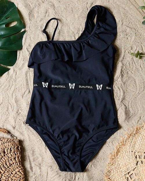 Czarny jednoczęściowy kostium kąpielowy damski z falbanką - Bielizna