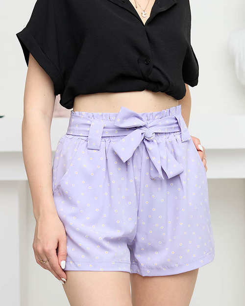 Fioletowe wzorzyste damskie materiałowe krótkie spodenki w kwiaty - Odzież