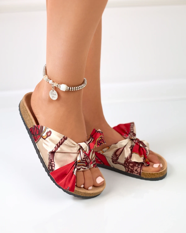 - Wygodne damskie klapki z tkaninową, wzorzystą wstążką - wkładka wykonana z eko-skóry zamszowej. Podeszwa z tworzywa sztucznego. Idealne do wakacyjnych stylizacji!