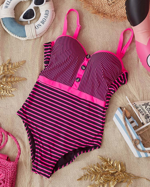 - Fantastyczny damski strój kąpielowy w paseczki, zdobiony guzikami. Model z usztywnianymi miseczkami i push-up, posiada wiązanie z tyłu i regulowane ramiączka. UWAGA: Dokładność pomiaru (+/-) 1 cm.