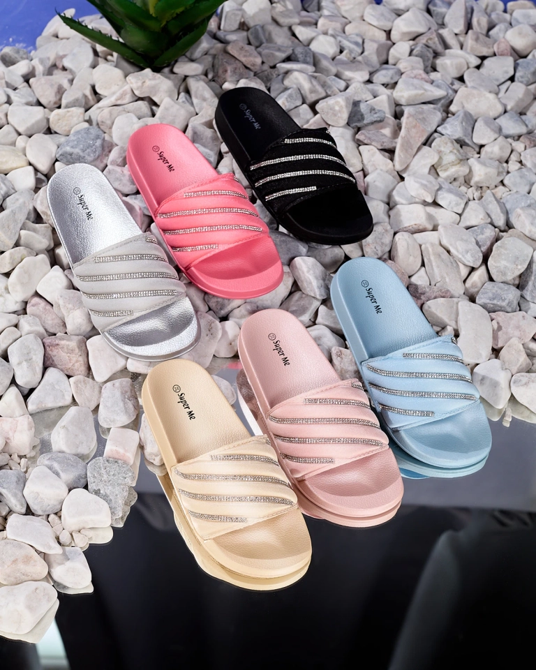 • Prześliczne damskie klapki na płaskiej podeszwie, zdobione drobnymi cyrkoniami, wkładka wykonana z tworzywa gumowego. Ta piękna para musi znaleźć się w Twojej walizce podczas urlopu!