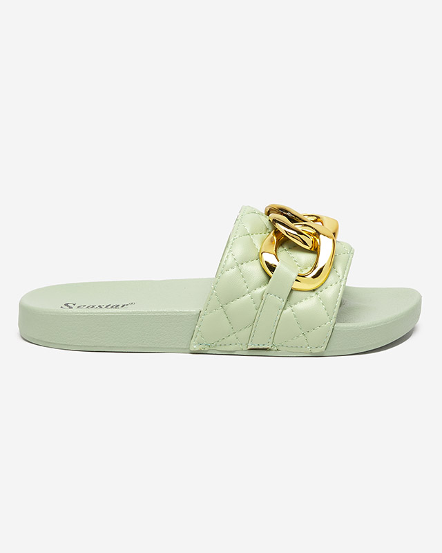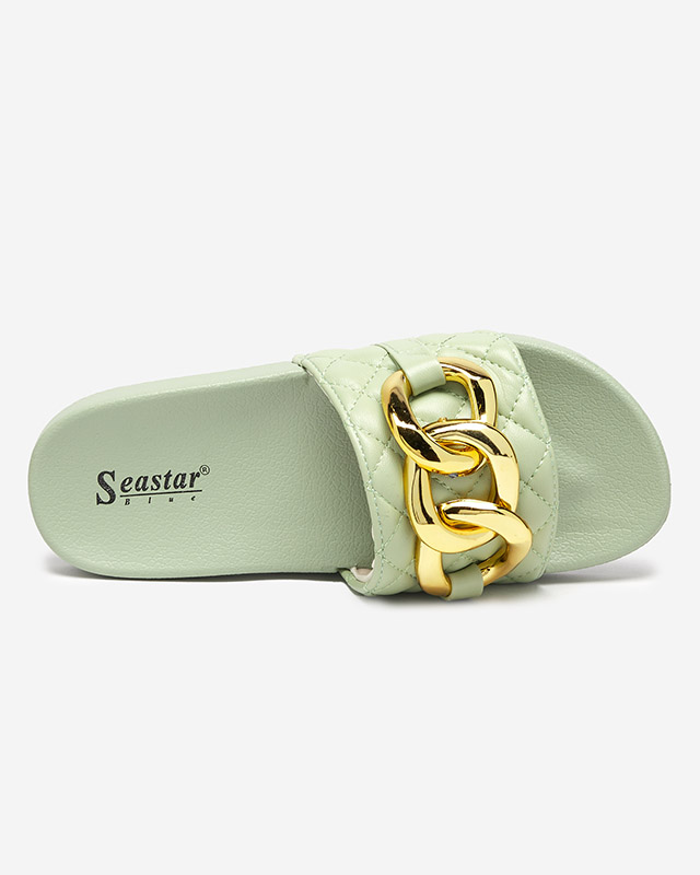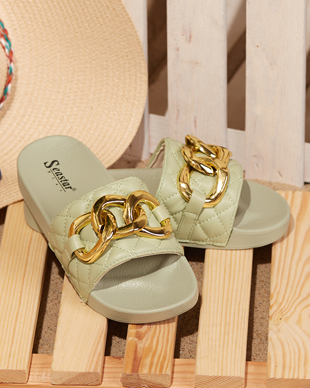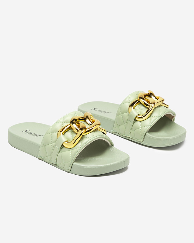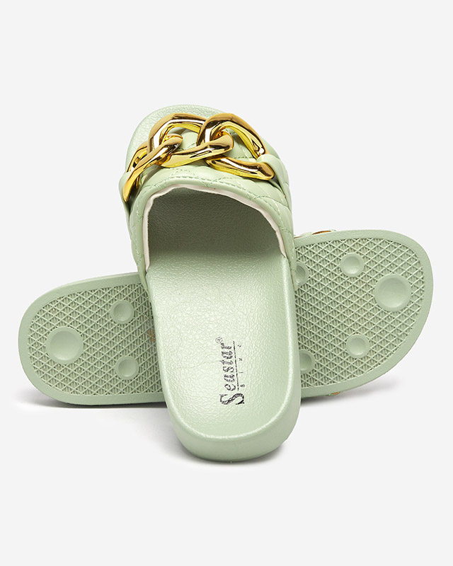 Zielone damskie pikowane klapki ze złotym łańcuszkiem Eteris - Obuwie