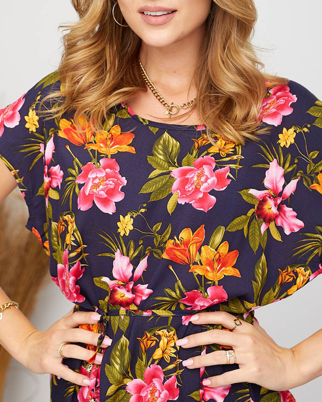 Damska letnia granatowa sukienka w kolorowe kwiaty - Odzież