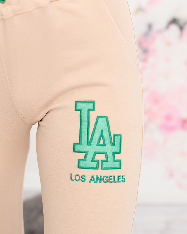 Beżowe damskie spodnie dresowe z kolorową naszywką - Odzież