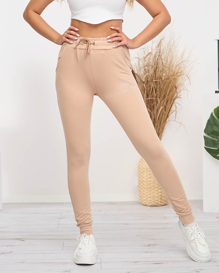 Beżowe damskie spodnie dresowe z cyrkoniami - Odzież