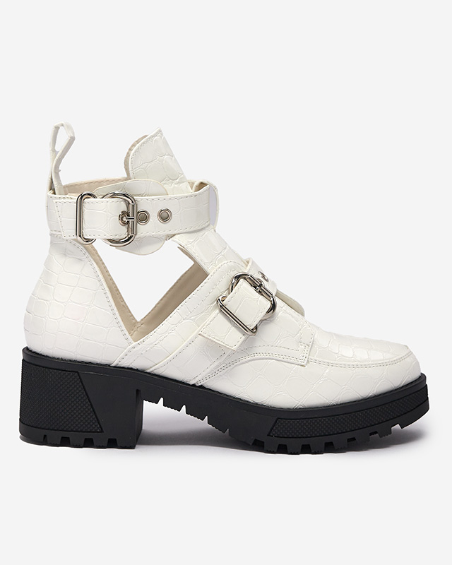 - Дамски ботуши с по-дебела подметка, изработени от лакирана еко кожа, която е завършена с декоративен релеф и катарами. Ботушите са с изрязване и закопчаване с катарама. БЕЛИ БОТУШИ ДАМСКИ БОТУШИ НЕИЗОЛИРАНИ MALEVIB