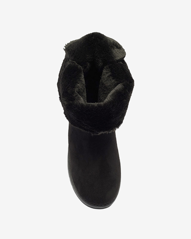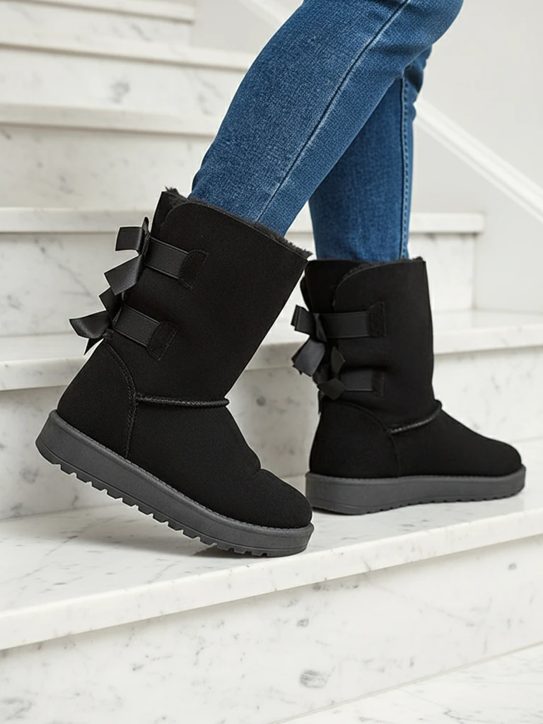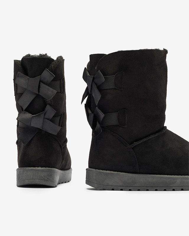 - Неподвластни на времето дамски зимни обувки, изработени от екологична велурена кожа. Моделът е украсен с панделки на гърба, а вътрешността е подплатена с мека кожа. Перфектни са за подчертаване на всяка ваша стилизация! ЧЕРНИ ЗИМНИ ОБУВКИ С ТОПЛА ПОДПЛАТА