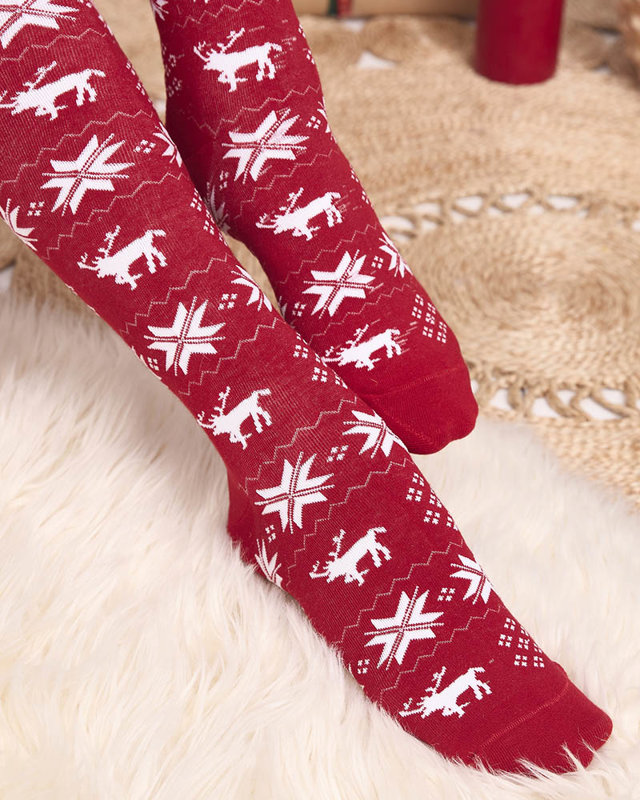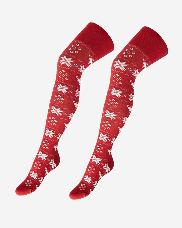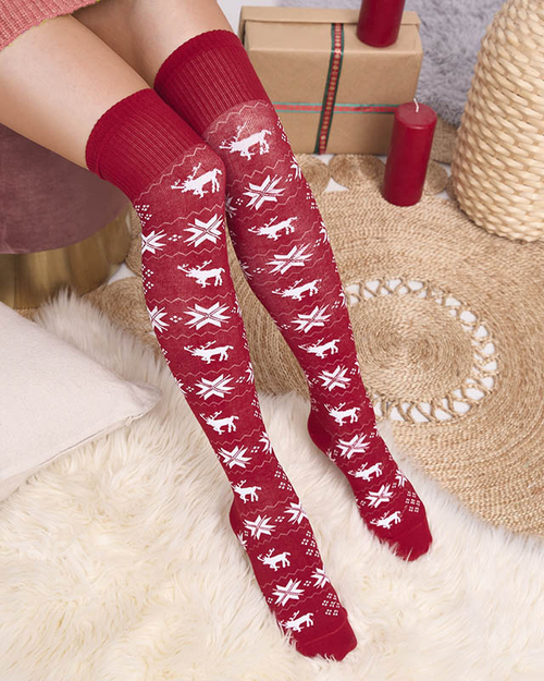 - Очарователни дамски чорапи над коляното, изработени от еластична памучна материя, завършени с коледна шарка. Топли и удобни - това е идеалният вариант за подарък!