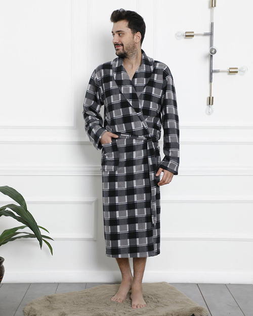 - Дълъг мъжки халат на каре, изработен от памучна материя. Моделът се завързва с колан, има джоб и висока яка. Перфектен за всеки сезон. ЗАБЕЛЕЖКА: Точност на измерване (+/-) 1 cm.