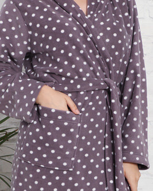- Дълъг дамски халат от памучна материя на точки. Удобството се допълва от голям страничен джоб и колан, който се връзва на талията. Перфектен за зимни моменти у дома ЗАБЕЛЕЖКА: Точност на измерване (+/-) 1 см.