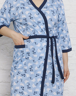 - Класически, лек дамски халат, изработен от мек 100% памук. Моделът е с широко деколте тип "плик" и ръкави с дължина 3/4. удобство придават големият джоб отстрани и коланът, завързан на талията. забележка: точност на измерването (+/-) 1 см.