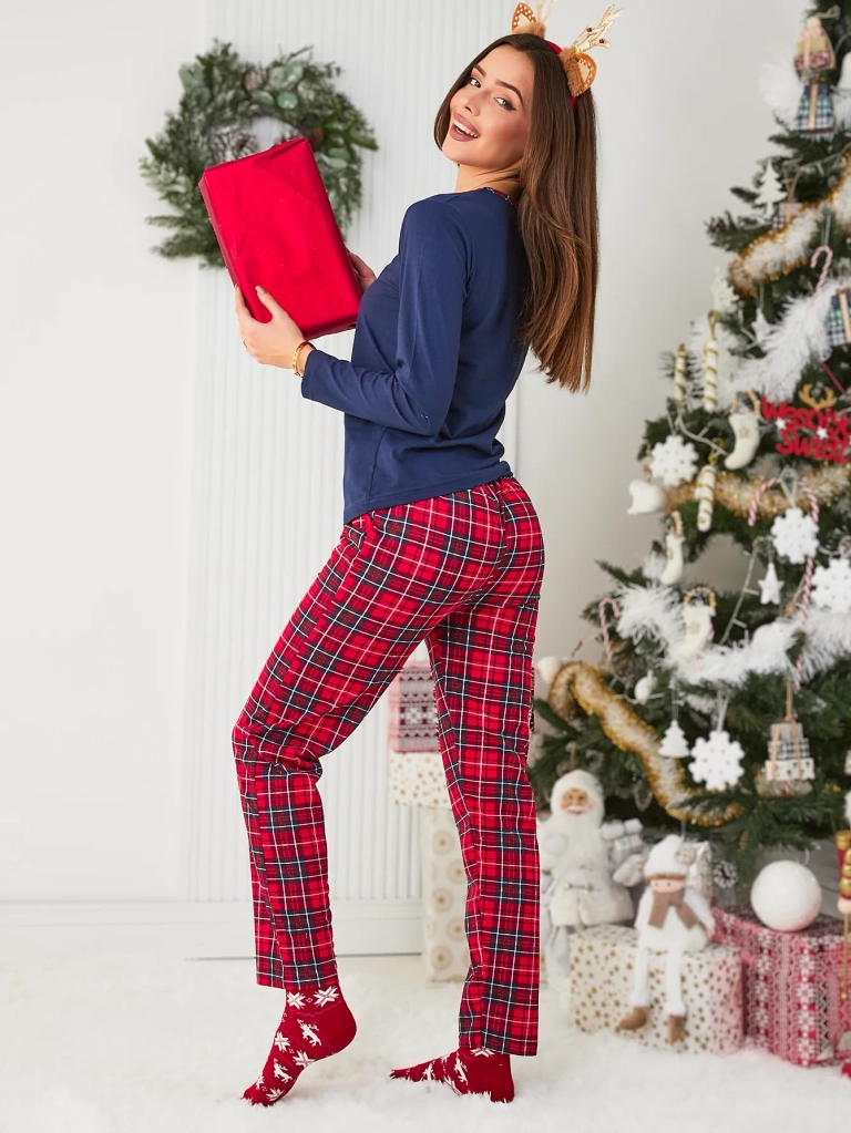 - Дамска пижама в тъмносиньо, изработена от памучна материя. Моделът е украсен с коледен принт, кариран панталон, блуза с елени. Перфектен подарък за Коледа! ЗАБЕЛЕЖКА: Точност на измерването (+/-) 1 см.