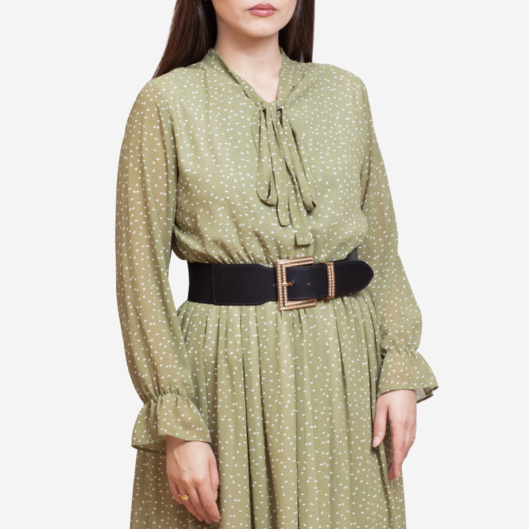 - Мега стилен дамски колан в черен цвят, изработен от комбинация от еко кожа и каучук. Моделът се закопчава с голяма златна катарама. Едно красиво допълнение към всеки стайлинг!