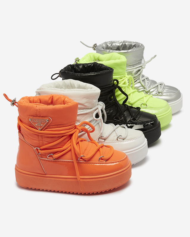 - Красиви детски обувки за сняг. Горната част е изработена от лакирана кожа и изкуствен материал а'ла маслен плат. Средата е изолирана с дебела кожа. Обувките имат издърпване в горната част на горната част и декоративно шнуроване.