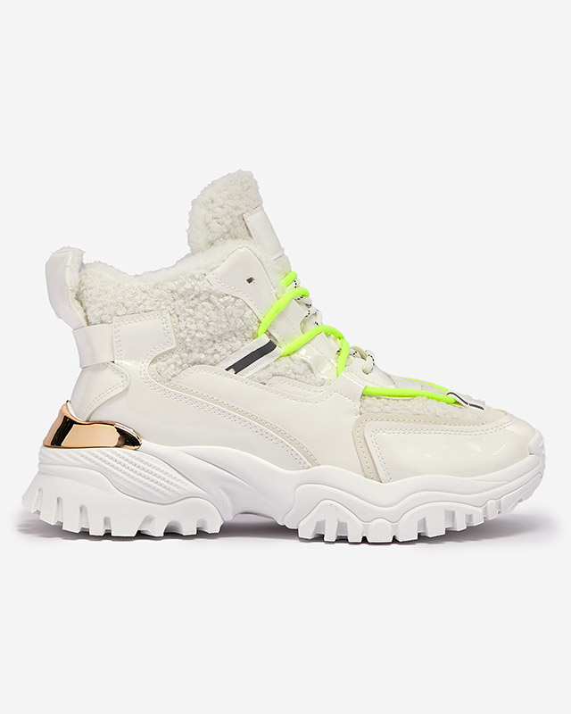 - Дамски спортни маратонки с дебела подметка, горната част е с връзки и е изработена от комбинация от лакирана еко кожа и плат а'ла кожа. Вътрешността е изцяло изолирана с изкуствена кожа. БЕЛИ СПОРТНИ ЗИМНИ ОБУВКИ ДАМСКИ БОТУШИ ЗА СНЯГ SAGGLO
