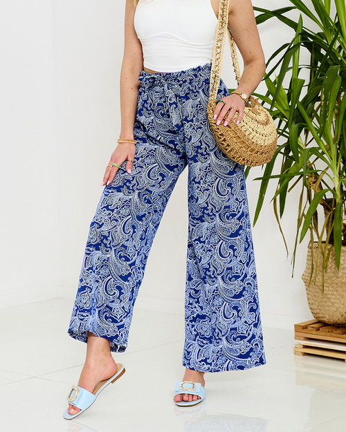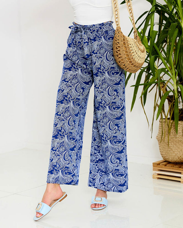 Дамски панталони от тъкан в морско синьо с щампа - Облекло