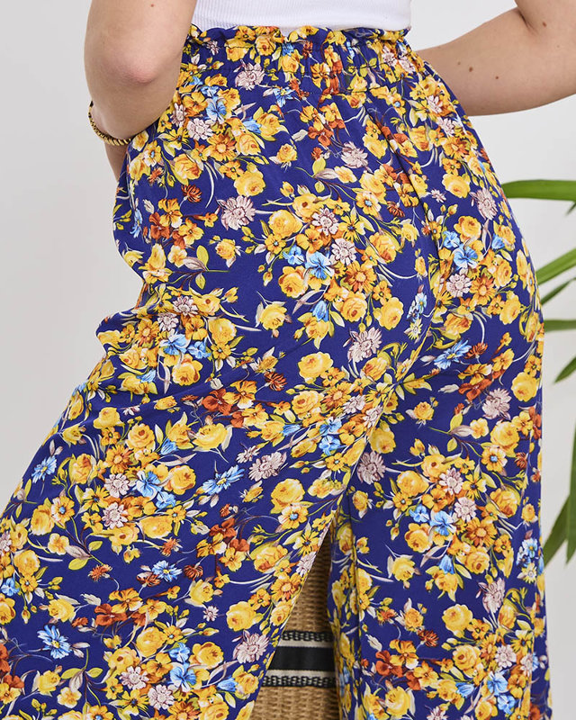 Дамски сини панталони палацо с тъмносини цветя - Облекло
