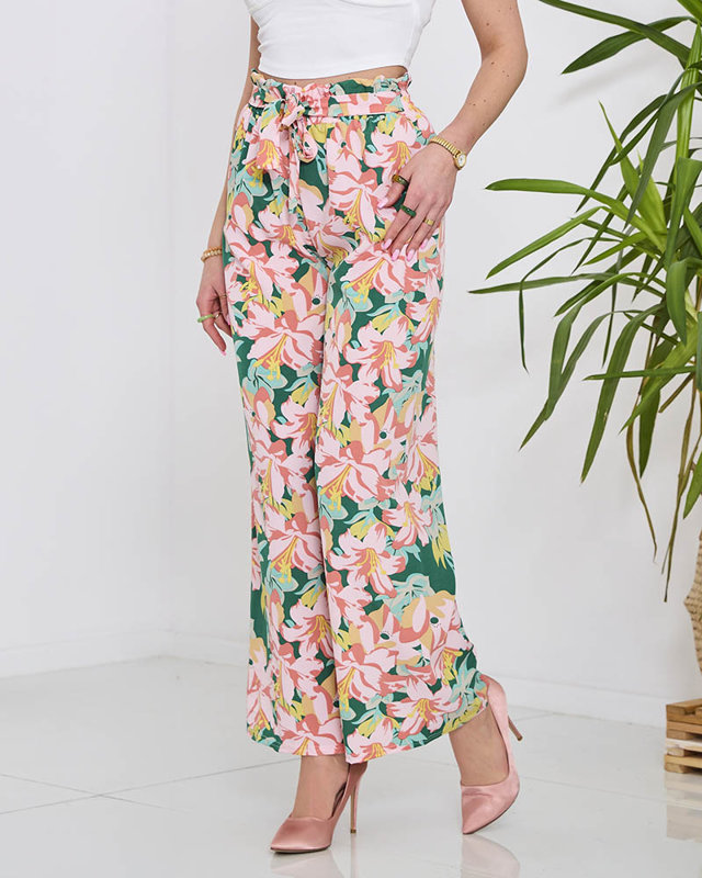 Зелени дамски панталони палацо с розови цветя - Облекло