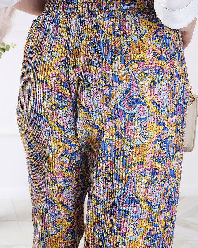 - Широк панталон от плат с широки крачоли. Моделът е изработен от лека и ефирна материя и има ластик и панталони на талията. Панталонът е украсен с цветна щампа. Идеални за лятото! ЗАБЕЛЕЖКА: Точност на измерването (+/-) 1 см.