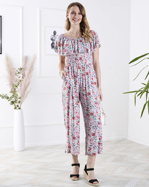 Дълъг дамски гащеризон с флорални мотиви в бяло и розово - Облекло