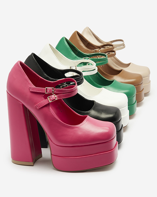 - Най-модерните дамски обувки с висок ток през този сезон. Обувките са изработени изцяло от еко кожа, Моделът се закопчава с две катарами. Перфектни обувки за създаване на модерни и оригинални тоалети!