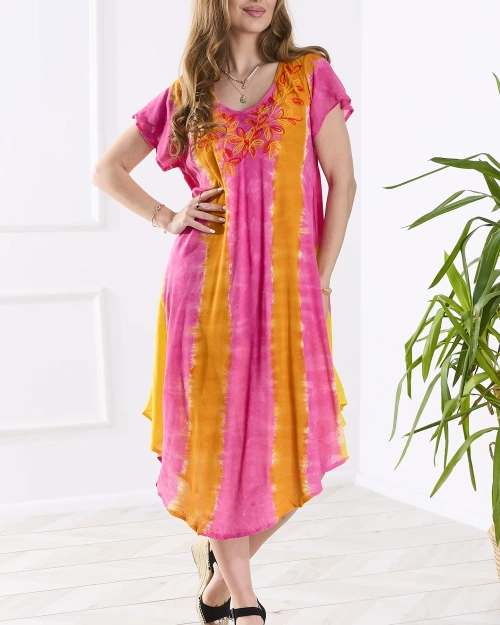 - Цветна дамска плажна рокля тип нарзутка, изработена от мека и ефирна материя, украсена с бродирани мотиви. Моделът е с кръгло деколте, къси ръкави и разкроен подгъв. Чудесен аксесоар за ваканцията! ЗАБЕЛЕЖКА: Точност на измерването (+/-) 1 см.