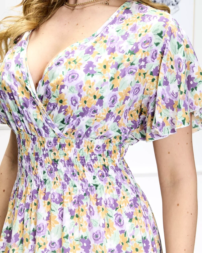 - Страхотна дамска рокля с миди дължина, изработена от памучна материя с флорални мотиви. Моделът е с деколте тип "плик", има къси ръкави и широк ластик за подчертаване на талията. Незаменим елемент от вашия гардероб! ЗАБЕЛЕЖКА: Точност на измерването (+/-)