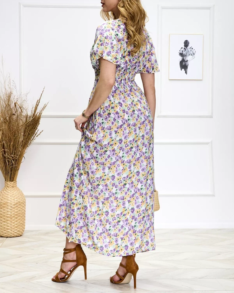 Дамска флорална миди рокля в лилаво-зелено - Обувки