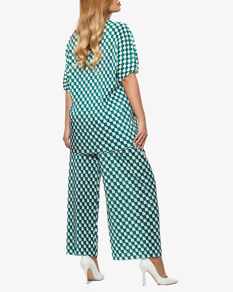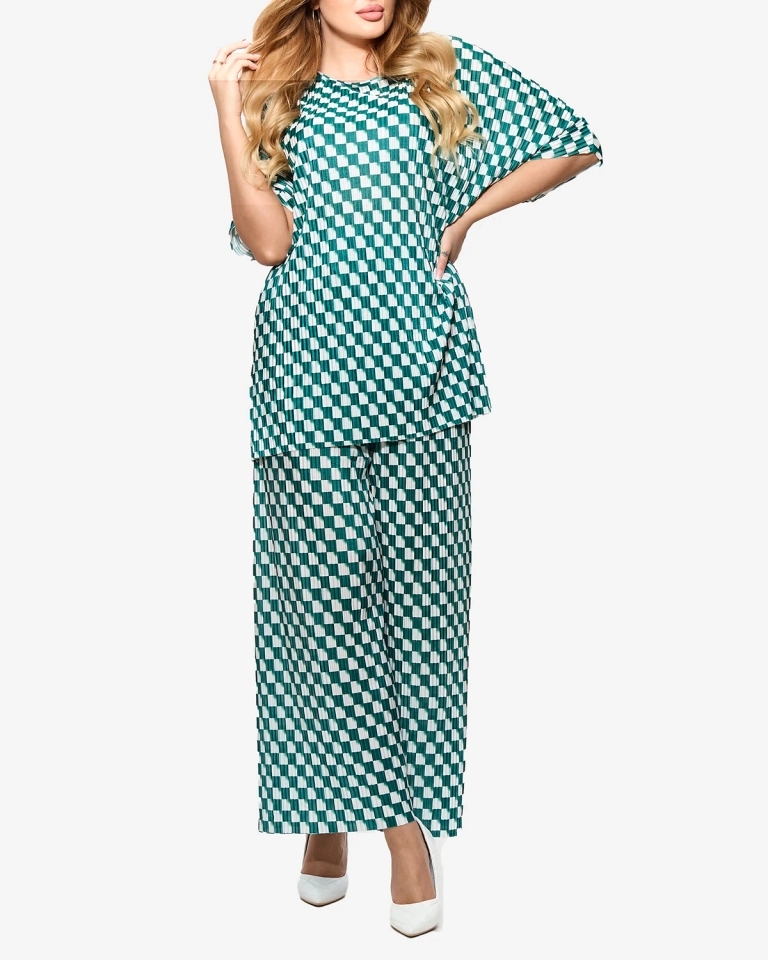 - Дамски шарен комплект, изработен от хлъзгава плисирана материя. Блузата с кръгло деколте е с къси ръкави. Панталонът тип палацо с широка гордост на мястото на талията и декоративни връзки. ЗАБЕЛЕЖКА: Точност на измерването (+/-) 1 см.