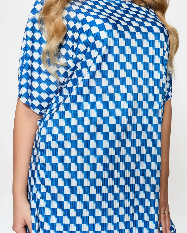 - Дамски шарен комплект, изработен от хлъзгава плисирана материя. Блузата с кръгло деколте е с къси ръкави. Панталонът тип палацо с широка гордост на мястото на талията и декоративни връзки. ЗАБЕЛЕЖКА: Точност на измерването (+/-) 1 см.